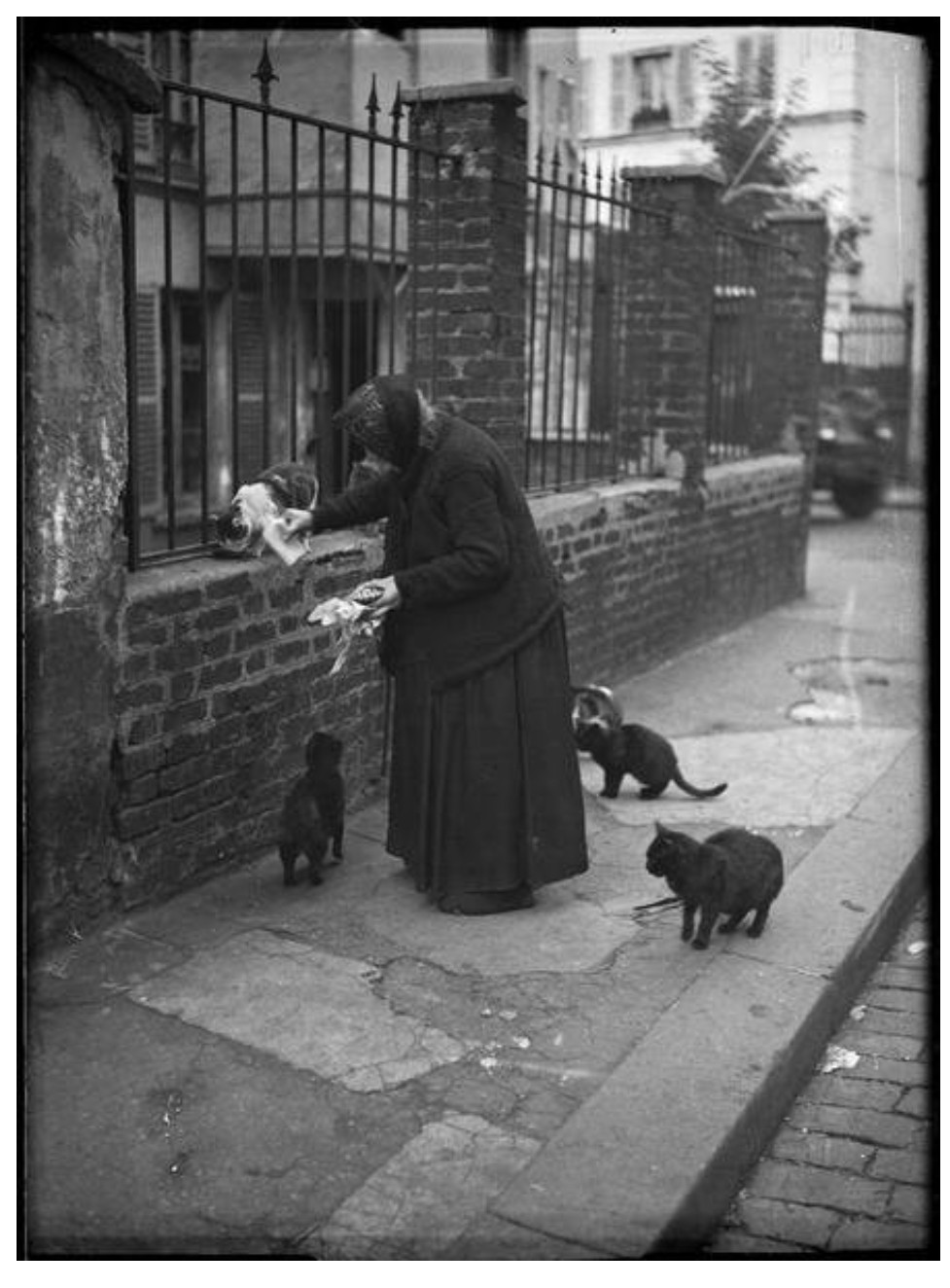 Mujer alimentando gatos. Foto de André Kertész, París 1927